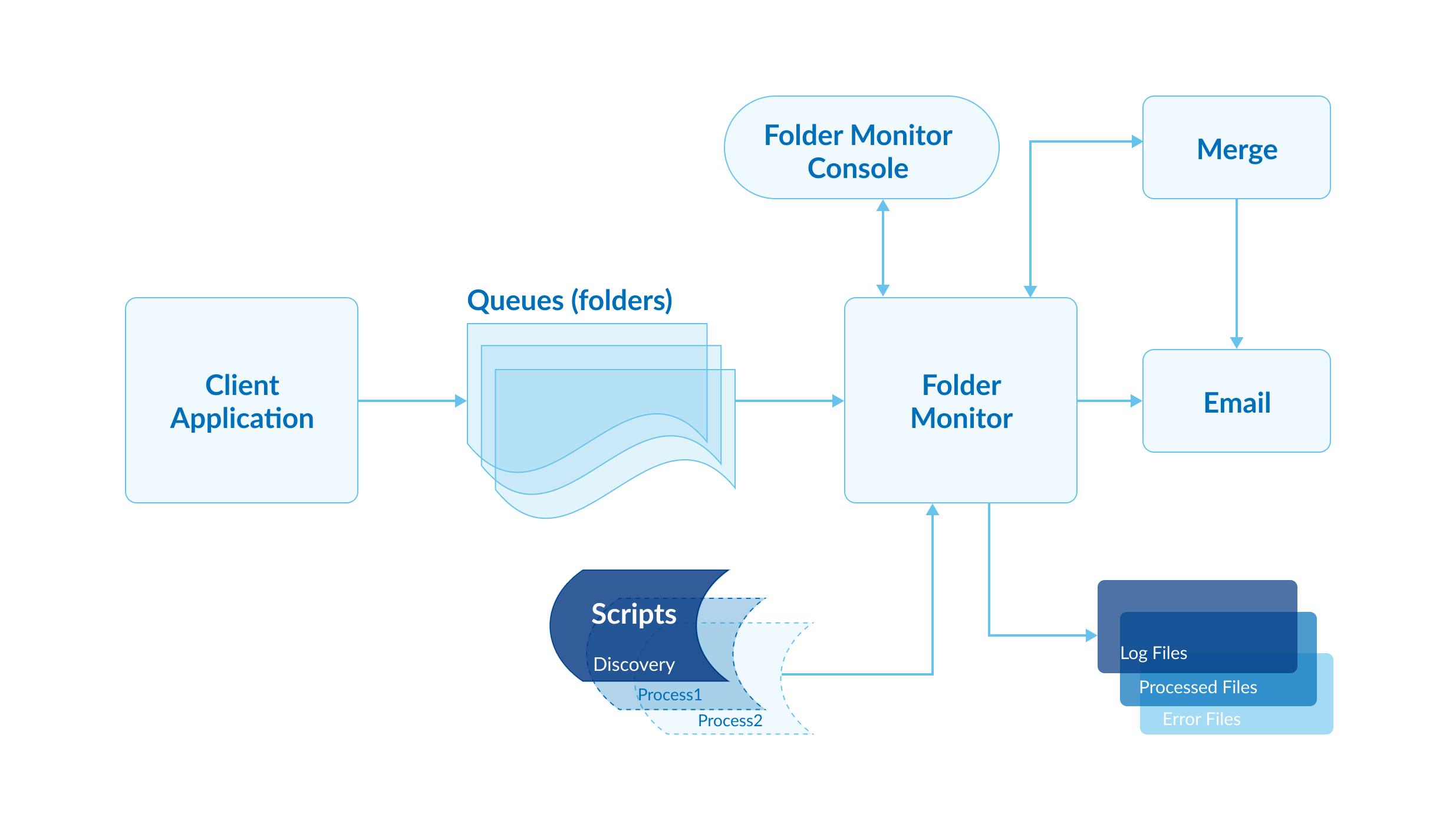 FolderMonitor is fed data files from Client Application(s). These files must be written into Queues (folders) identified in FolderMonitor's configuration. Each of those files is considered a 'job', in DocOrigin parlance. When the file appears in the Queue (folder) FolderMonitor will read the file and process it using a two-step process: