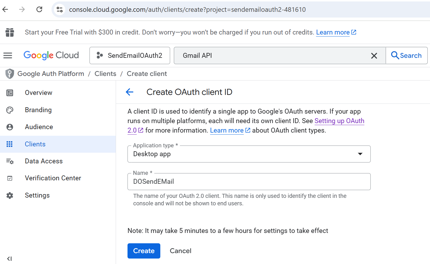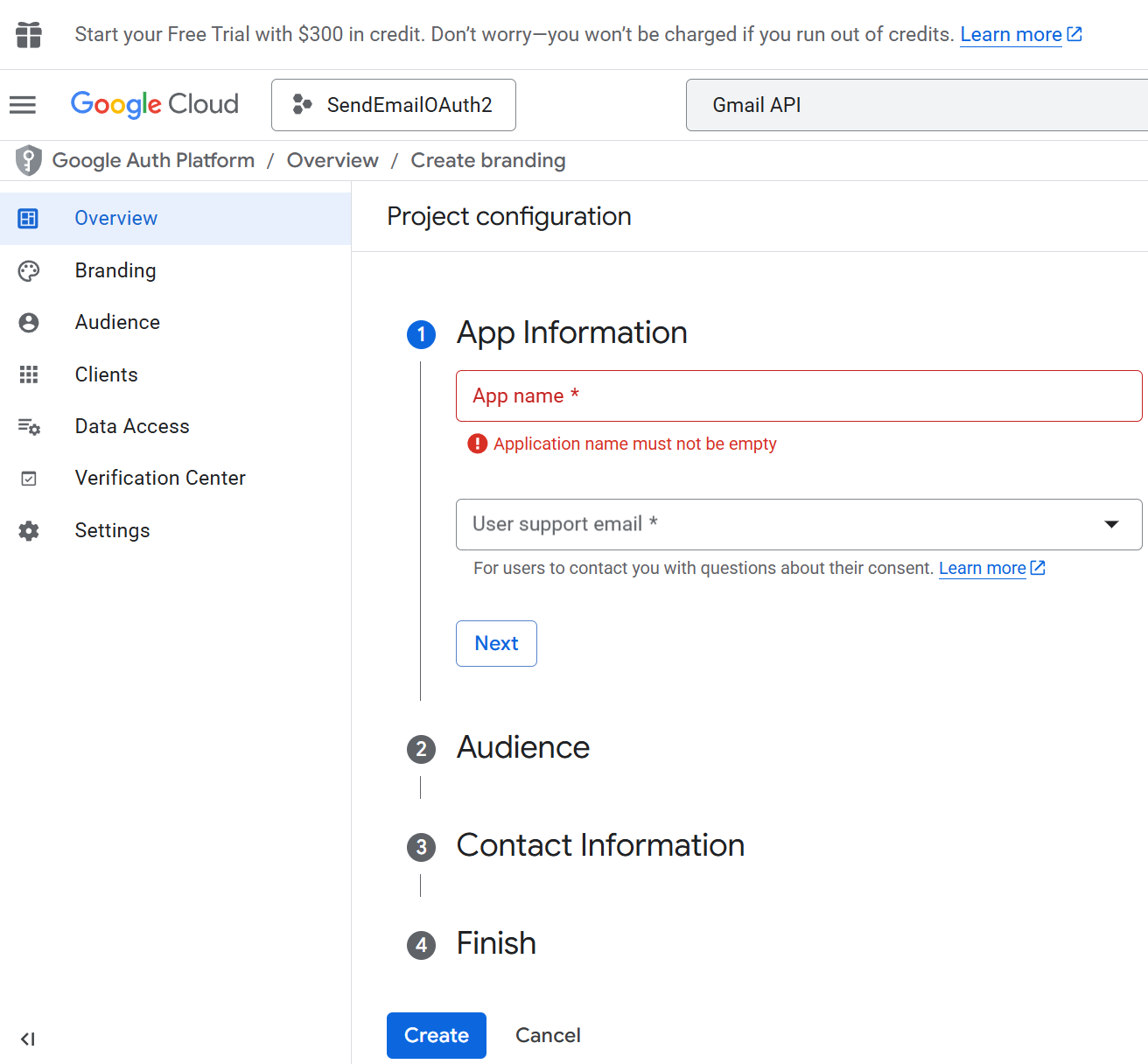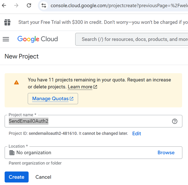 First create a new project (or select existing). Enter a project name (e.g. ‘SendEmailOAuth2’) and select the storage location. (If no organizations are defined, keep “No organization”).
