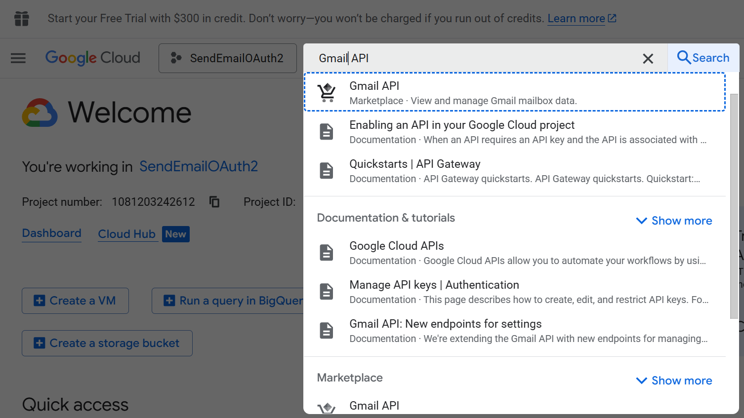 - Allow the created project to use the Gmail API. To do this, click with the mouse in the search field at the top of the screen, enter “Gmail API” and then click on the corresponding search result. Activate the Google API.