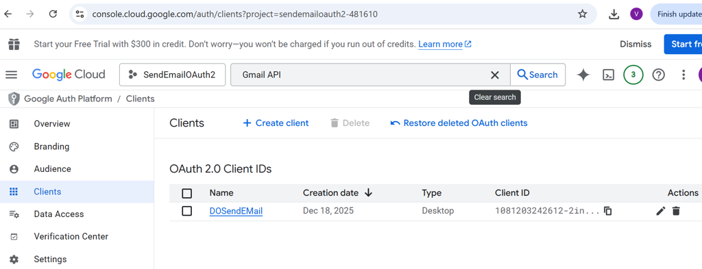 - At the bottom of “OAuth client created“ window click “Download JSON“ to save application credentials that are required for the emails sending. The newly created client is now displayed in the list of OAuth 2.0 clients. The settings of the client can be displayed by clicking on its name. The displayed client ID and the client key are essential for the following setup in DO.