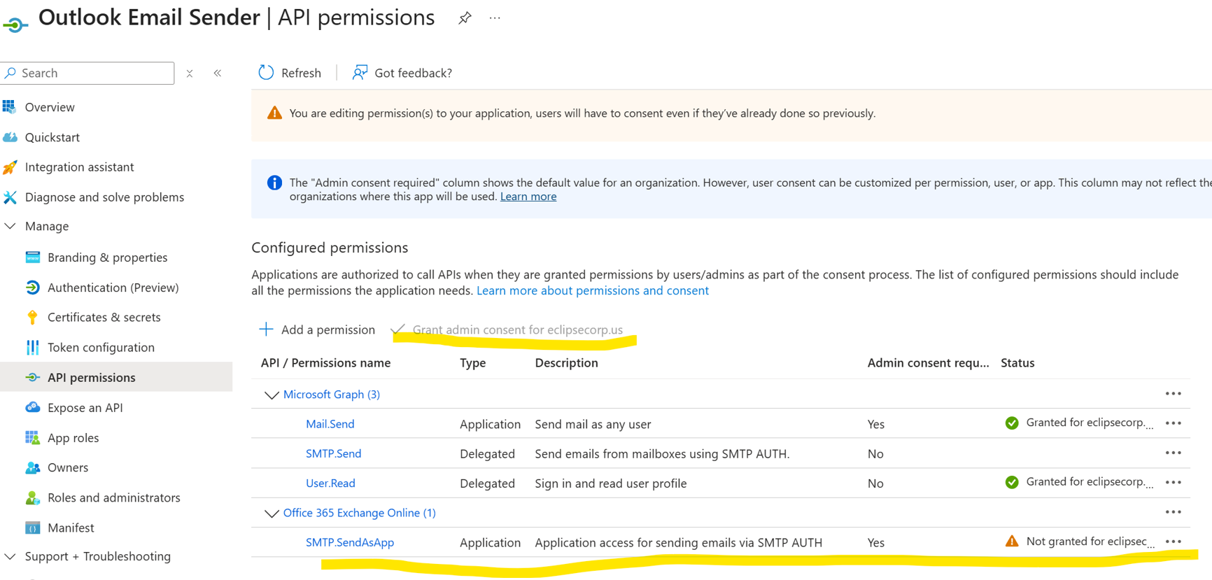 Once the application is registered, you can grant the application the required access rights to send email via Outlook SMTP: